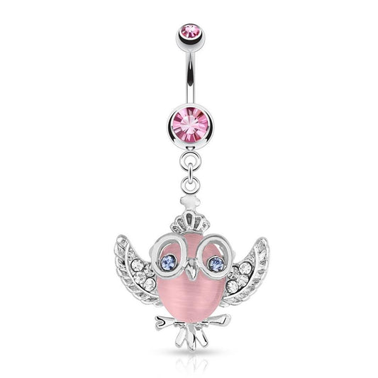 Bauchnabelpiercing aus Edelstahl Chirurgenstahl 316L mit Anhänger Eule mit Katzenaugen und Zirkonia farblos pink