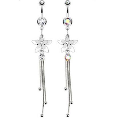 • Der lange Anhänger des Nabelpiercings ist eine Blume / Blüte an der ein eingefasster Zirkonia und drei Fäden hängen.