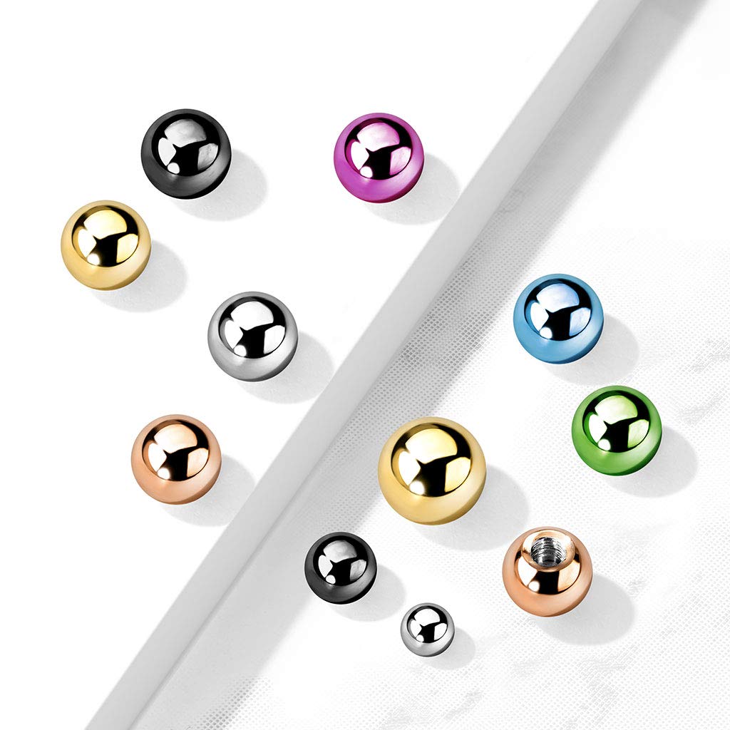 - FREIE WAHL - Wählen Sie die Verschluß-Kugel aus den Gewindestärken 1,2-mm oder 1,6-mm. Je nach Stärke haben Sie die Ballgröße 3-mm, 4-mm, 5-mm und 6-mm zur Auswahl. Die Farbe ist wählbar zwischen Lila, Blau, Grün, Gold, Schwarz, Rosegold und Silber.
