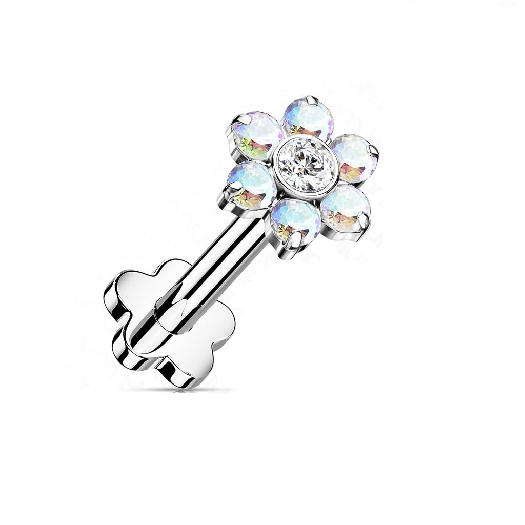 - ABMESSUNGEN - Der Conch Piercing Threadless-Schmuck besteht aus dem 1,2-mm dicken und 8-mm langen Stab und einer 5-mm großen Blumen besetzt mit 7 Zirkoniasteinen. Diese erhalten Sie in den Farben Regenbogen, Klar, Pink, Türkis und Regenbogen dunkel .